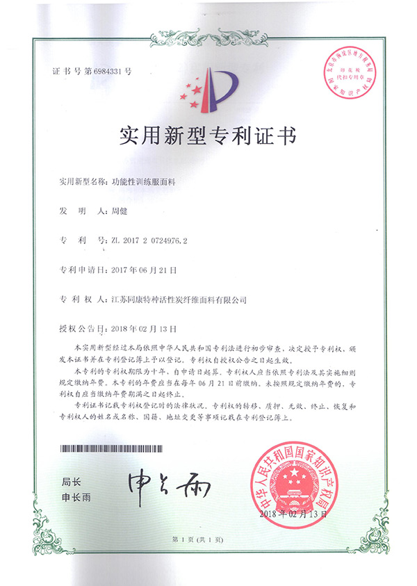 專利證書功能性訓(xùn)練服面料